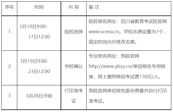 考生应于2022年3月19日9:00至3月23日12:00,登录学院官网(http://www.ybzy.cn/),确定所报考学校的专业志愿,并缴纳报名考试费130元/人。否则,视为自愿放弃高职单招。